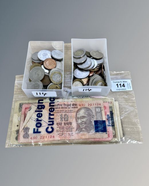A quantity of foreign currency, both coins and twenty one bank notes - India, Denmark, Switzerland, Germany, Holland, etc. (Q)