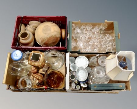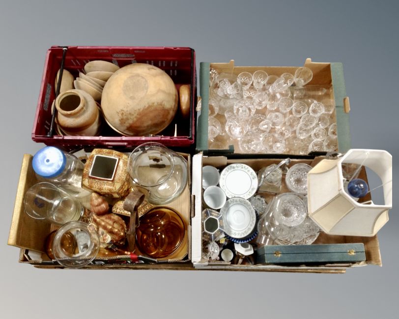 A pallet with four boxes containing glass vases, drinking vessels, wooden bowls, tea china, Oriental wares etc.