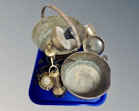 A tray of two graduated vintage brass cast iron handled jam pans, Joseph Lucas lamp, together with a vintage candlestick telephone