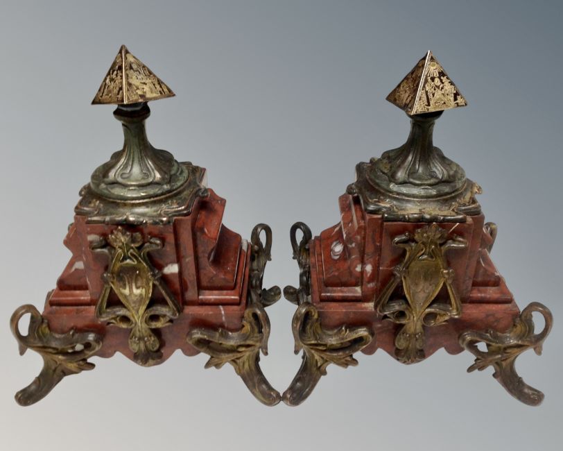 A pair of Art Nouveau metal and red marble garniture stands
