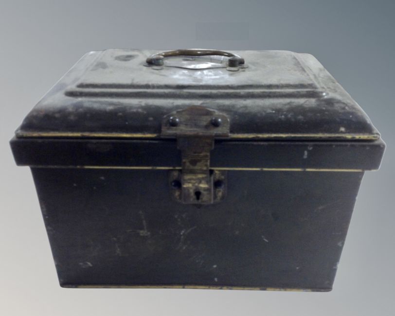 A 19th century lacquered tin storage box.