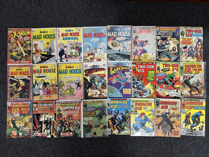 A box containing a large collection of vintage and later comics including Classics Illustrated, Marvel Comics Fantastic 4, Conan the Barbarian, Machine Man, X-Men, Kid Colt Outlaw, The Outlaw Kid, The Incredible Hulk, The Invincible Iron Man, DC Superman and Action Comics, Archie Comics.