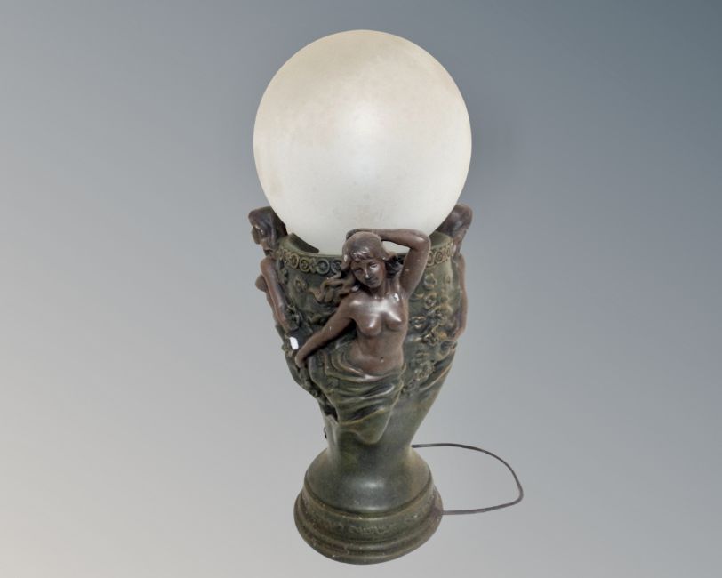An Art Nouveau style cast plaster table lamp with clouded glass shade.