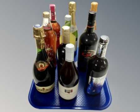 A tray containing 10 assorted bottles of alcohol including French Rosé, mulled wine, Bacardi etc.