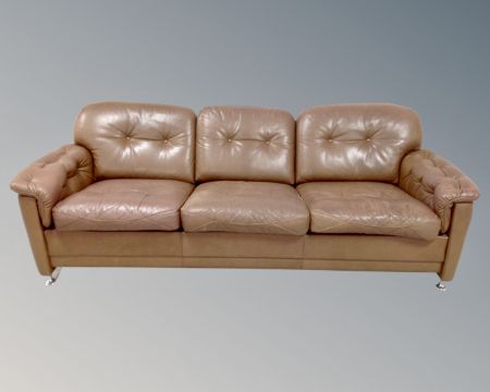 A 1970s Scandinavian brown button leather three seater settee.