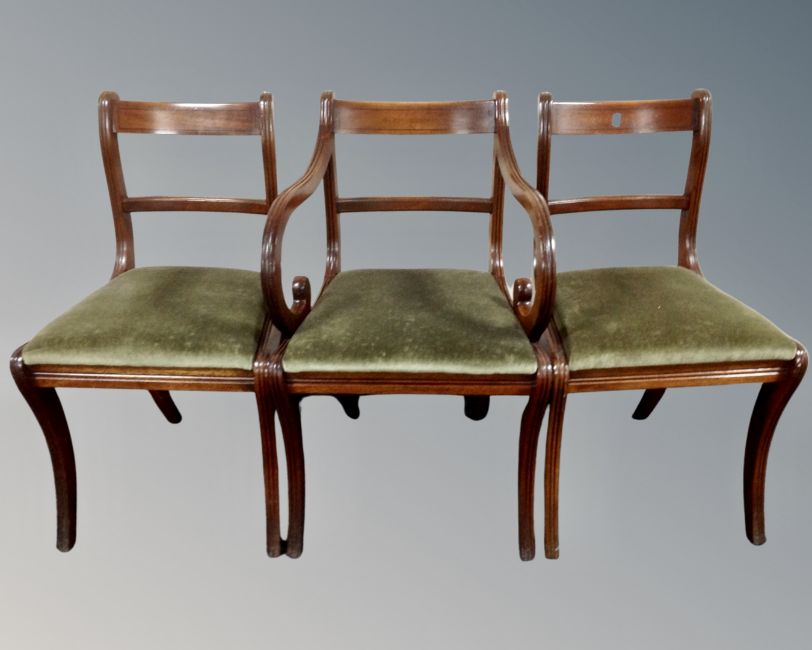 A Regency style oval twin pedestal dining table with leaf, together with a set of six chairs, two carvers and four singles.