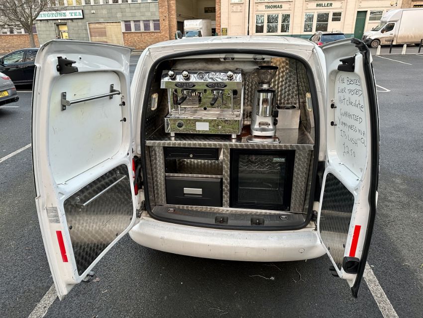 A Volkswagen Caddy commercial coffee van, RO11 FMV, first registered 2011, one former keeper, colour white, 1598cc, diesel, MOT expires 15/01/2024, odometer reads 158676, two keys, part service history. Professionally fitted out as a commercial coffee selling enterprise. Containing the following equipment: Fracino 2 group gas machine, Mazzer grinder, Wacco fridge drawer, underslung LPG tank, water tank, cash drawer, battery charger and inverter, electric hook up and charging.