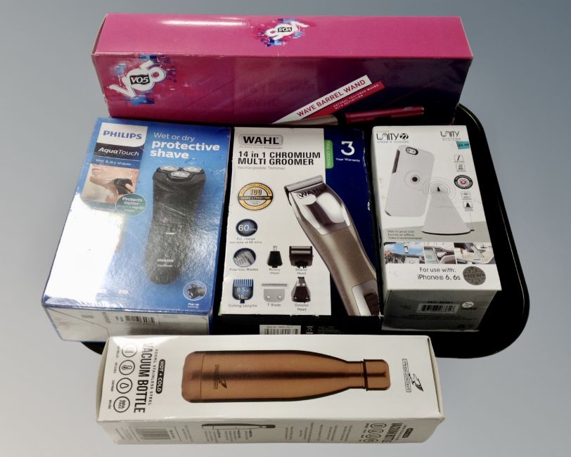 A boxed V05 hair wand together with a Philips wet and dry shaver, Wahl 14 in 1 groomer, Falcon vacuum bottle and a Unity System iPhone for iPhone 6 and 6s. (all boxed)