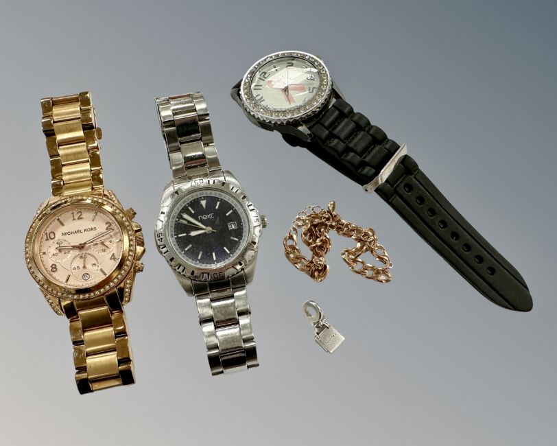 A Pandora charm together with a gold plated bracelet, a Michael Kors wristwatch and two further wristwatches.
