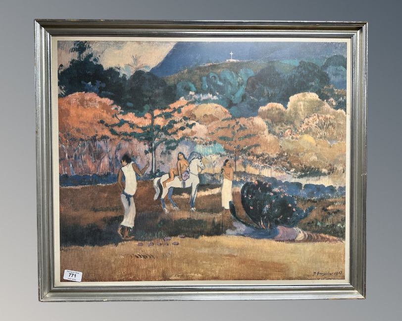 A continental colour print depicting a naked figure on horseback, 63cm by 54cm.