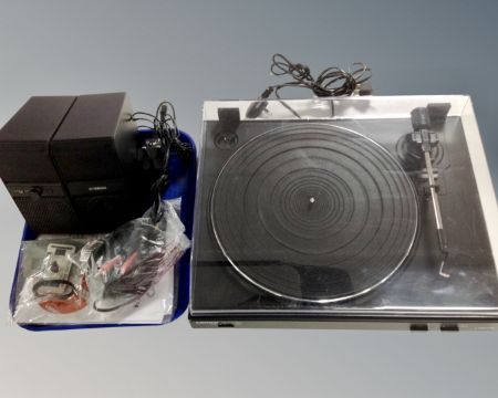 A Lenco L-3867 USB turntable together with a pair of Yamaha mini speakers.