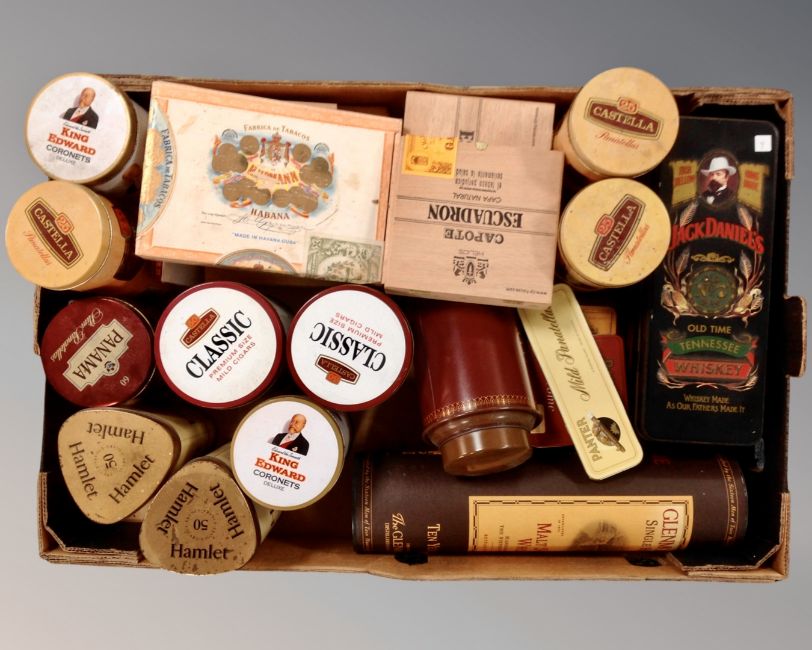 A box containing a quantity of whiskey and cigar tins and cigar boxes.
