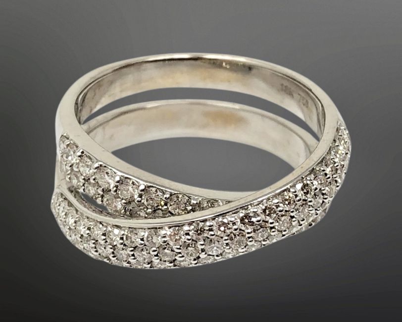 An 18ct white gold diamond cross over ring set with forty two diamonds, size O/P.