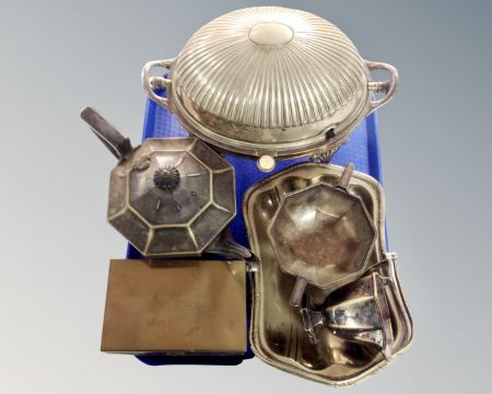 A tray containing antique and later plated wares including table cigarette box, three piece tea service, food warmer on stand together with a swing handled basket.