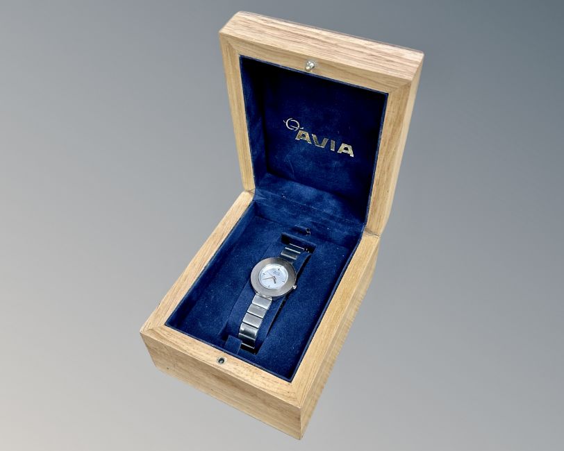 A lady's stainless steel Avia wristwatch in box.