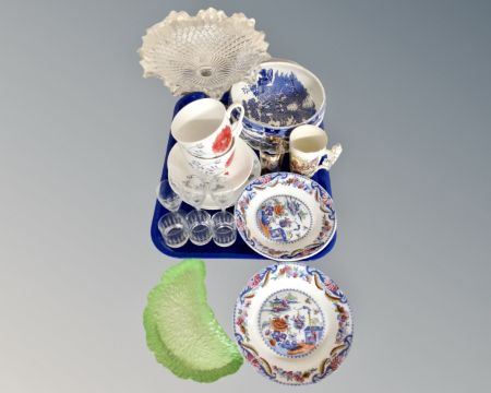 A tray of coronation mug, glass ware, Carlton Ware leaf dish, Maling willow pattern fruit bowl, pair of antique Oriental porcelain plates