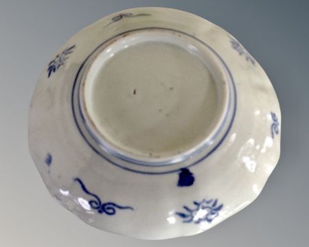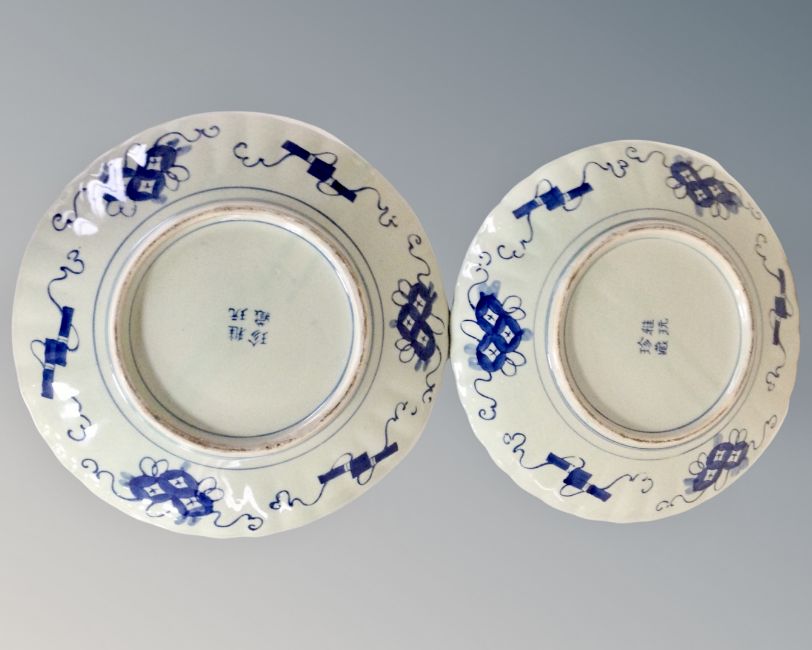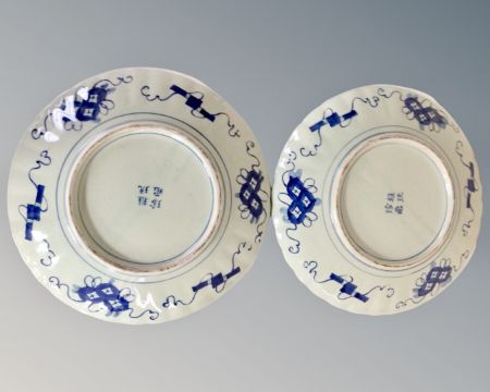A pair of Imari scalloped edge dishes, width 31 cm, character marks to base and a further Imari scalloped edge dish, width 21 cm (3)