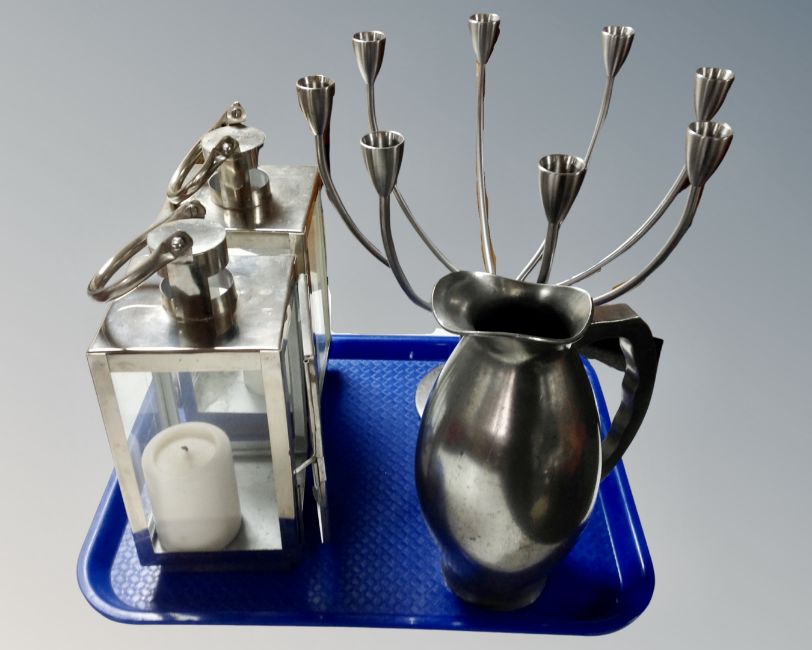 A K. Hogberg designed eight way table candelabrum together with a vintage pewter jug and two hurricane lamps.