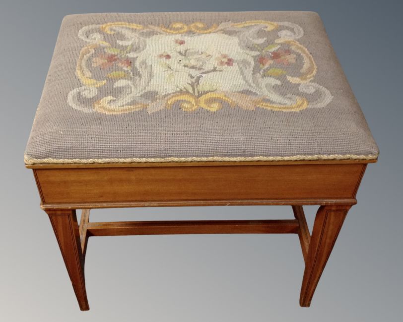 A 20th century inlaid satinwood storage piano stool with tapestry top.