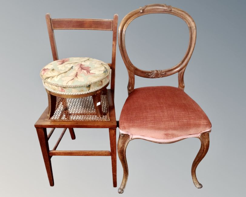 A Victorian mahogany dining chair on cabriole legs together with an inlaid mahogany footstool and an inlaid mahogany bedroom chair.
