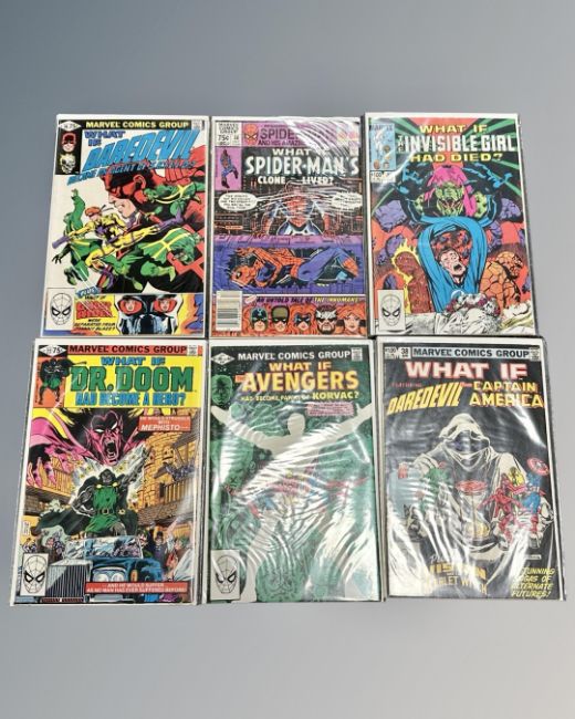 A collection of six vintage Marvel 'What If' comics, including Daredevil, Spider-Man and Dr. Doom issues, in plastic covers.