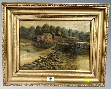 R. A. Rennison : Buildings by a wear, oil on canvas, 36cm by 25cm.