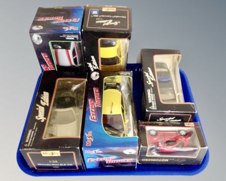 Five Maisto 1:24 scale die cast vehicles : Mercedes Benz, Chevrolet, etc, a further Maisto 1:43 scale VW Beetle, all parts boxed