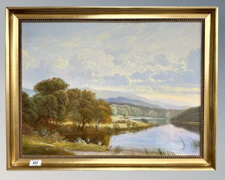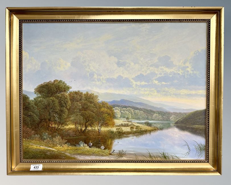 Andrew Grant Kurtis (British Contemporary) : Children fishing by a loch, oil on canvas, 60cm by 45cm.