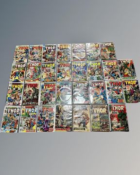 A collection of approximately 30 vintage Marvel The Mighty Thor comics, in plastic covers.