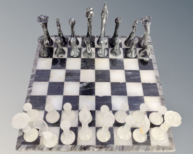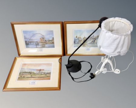 A box containing three Tom Harland signed limited edition prints, two contemporary table lamps and a marble chess set. (AF)