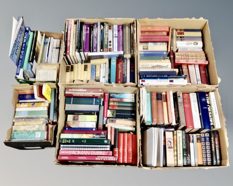 Six boxes containing hard and soft back volumes including novels, reference, British Empire history etc.