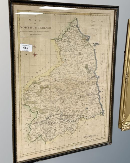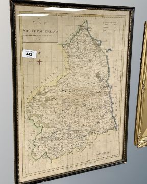 An 18th century hand coloured map of Northumberland, London engraved for J. Harrison, 35cm by 49cm.