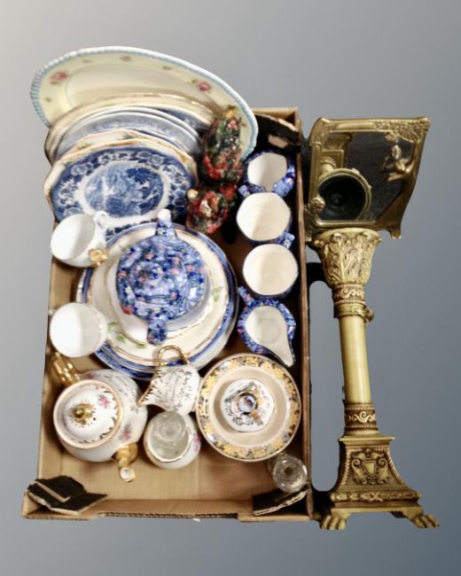 A box containing tea china, Ringtons chintz ware, a brass framed Art Deco style table mirror, glass vases etc.