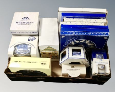 A box of Ringtons blue and white china, collectors plates, vases etc
