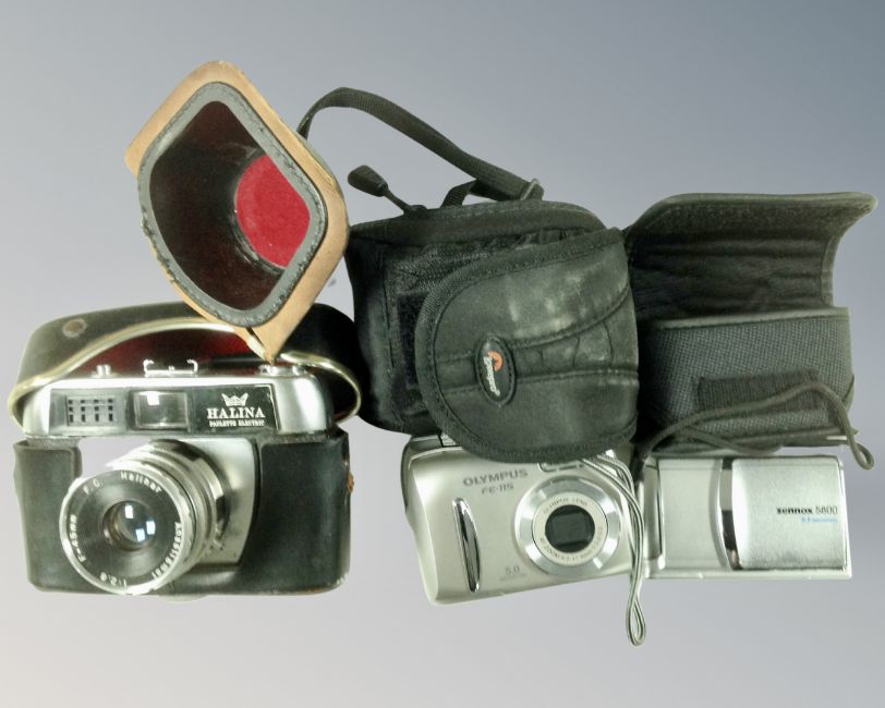 A Casio CTK-560 L electric keyboard together with three cameras, Halina, Olympus etc