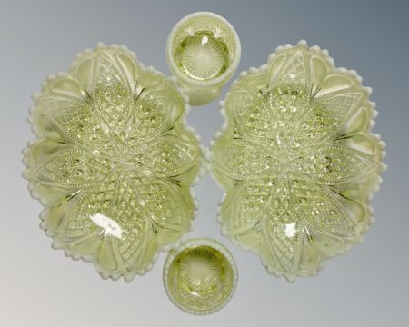 A pair of Davidsons Primrose vaseline glass Lords and ladies bowls (width 20.5 cm) together with pair of similar salts. (4)