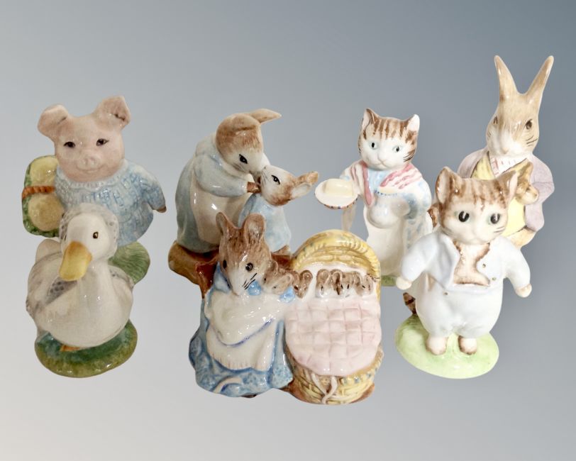 Five Royal Albert Beatrix Potter figures including Little Pig Robinson, Hunca Munca, Mr. Benjamin Bunny, Mrs. Ribby and Mrs. Rabbit and Peter together with two further Beswick figures including Tom Kitten and Rebeccah Puddleduck. (7)