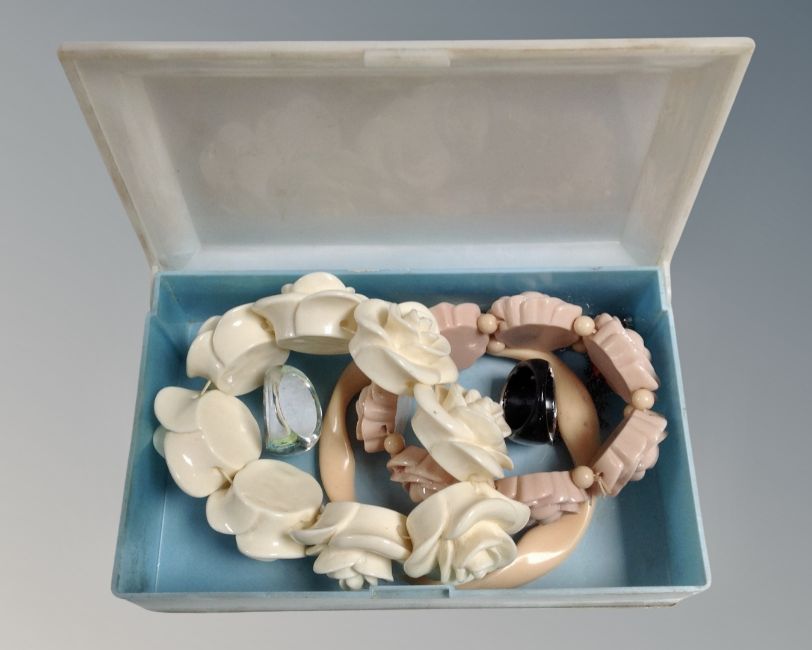 A contemporary jewellery box together with a 1950/60's plastic jewellery box depicting ballerinas, containing bracelets, dress rings etc