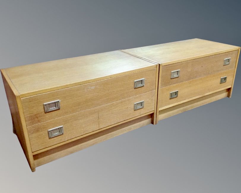 A pair of oak effect two drawer low chests. (width 76cm each)