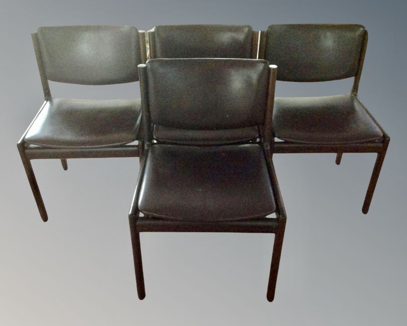 A set of four late 20th century continental dining chairs in brown vinyl upholstery.