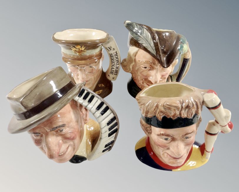 Four Royal Doulton character jugs comprising of Jimmy Durant, Glenn Miller, Robin Hood and the juggler