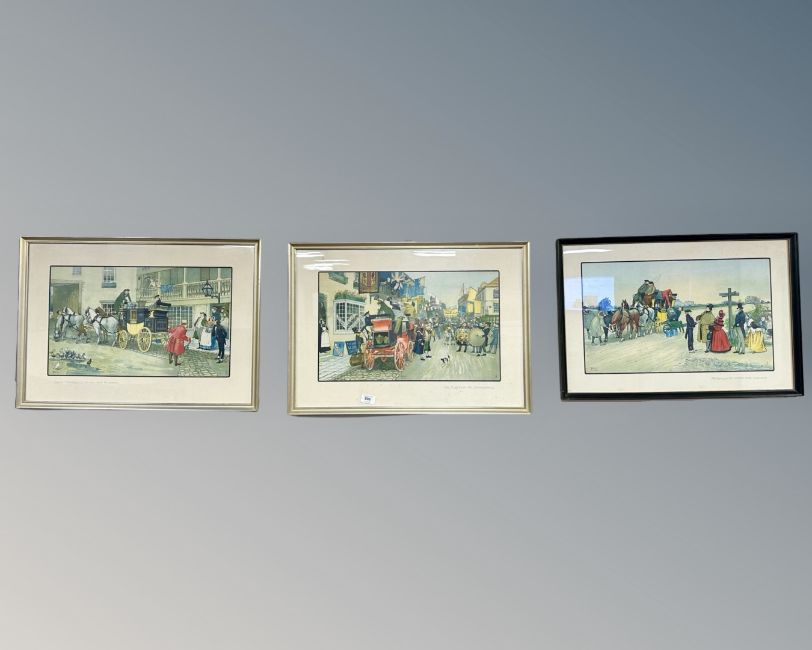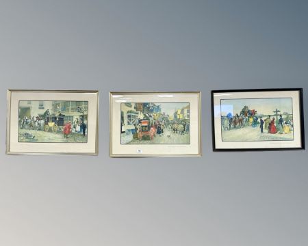 After Ludovici : 'David Copperfield on his way to school', colour print, 50cm by 30cm, together with two further colour prints, 'The Election at Eatanswill' and 'Mr. Pecksniff Leaves for London'. (3)