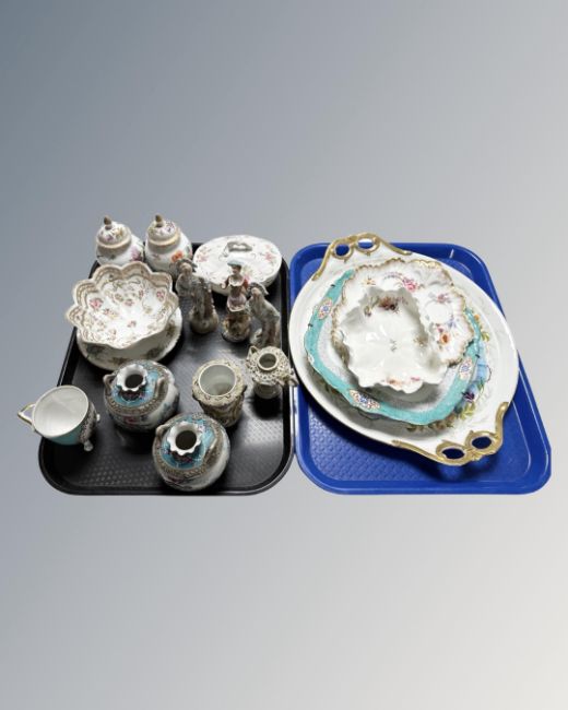 Two trays of Continental porcelain including Dresden figures, pair of Dresden lidded vase, urns, plates etc