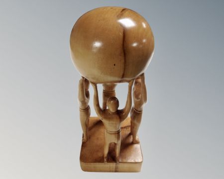 A wooden hand carving of four figures holding a globe aloft, signed H Stone, dated March 2007.
