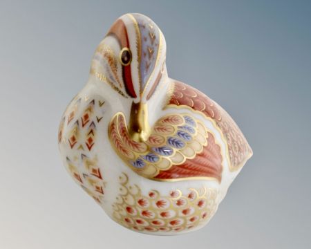 A Royal Crown Derby teal duckling paperweight with gold stopper.