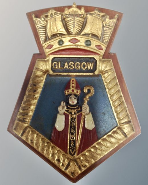 A painted cast iron Glasgow plaque mounted on wooden board. (length 29cm)