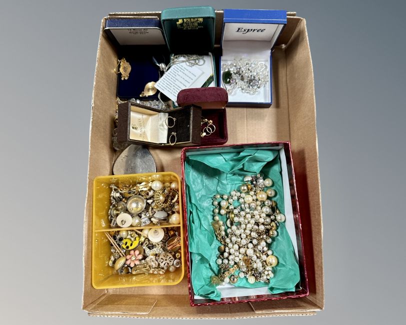 A collection of costume jewellery, yellow metal earrings indistinctly stamped, necklaces etc