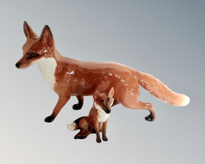 A Beswick fox, length 24cm, together with a seated Beswick fox.