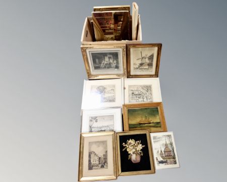 A box containing assorted pictures and prints, landscapes, hand coloured engravings etc.