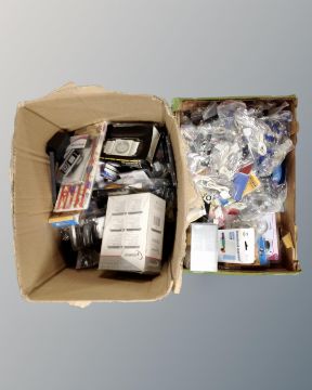 Two boxes of assorted cables and chargers, iPod cases, Mp3 speakers etc